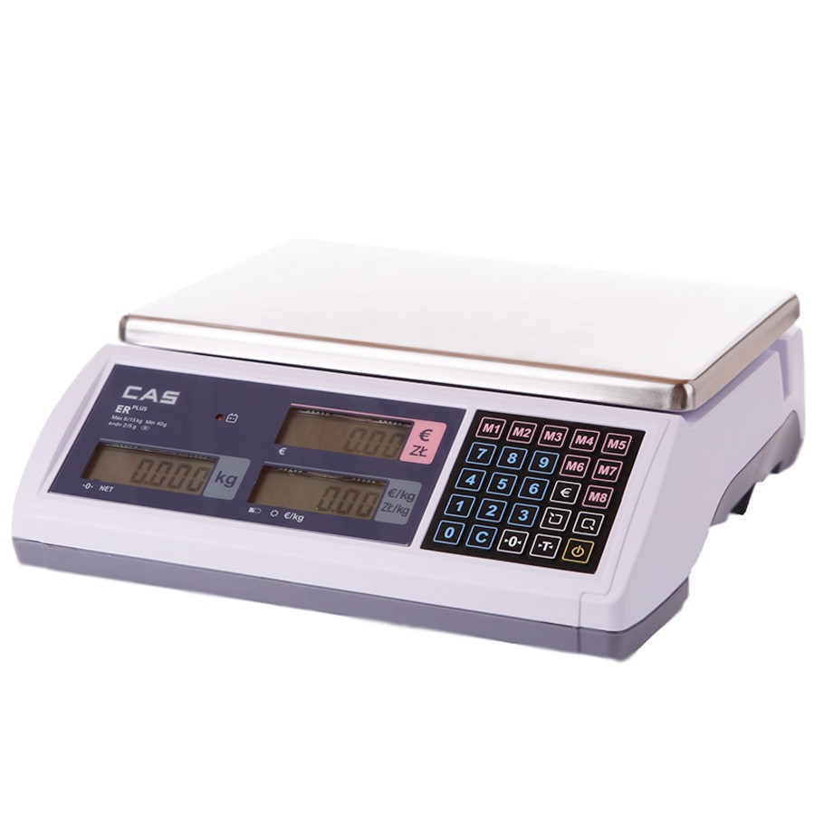 Wagi kalkulacyjne CAS ER PLUS idealnie sprawdzają się w tradycyjnych punktach sprzedaży, na bazarach oraz przy sprzedaży obwoźnej. Niewątpliwym atrybutem tych urządzeń jest nowoczesna konstrukcja. Waga dwudziałkowa, dzięki automatycznej zmianie działki waga zapewnia wysoką dokładność pomiarów masy. Wbudowany akumulator po pełnym naładowaniu zapewnia do 200h pracy bez zasilania. Podświetlany wyświetlacz LCD ułatwia korzystanie z wagi w miejscach słabo oświetlonych. 200 kodów PLU. Wagi posiadają wodoodporną klawiaturę na mikroprzełącznikach, przeliczanie waluty EURO, port RS232C do współpracy z kasami fiskalnymi lub komputerem (protokół AP-1). Dwie szalki w standardzie: ze stali nierdzewnej i plastiku.
