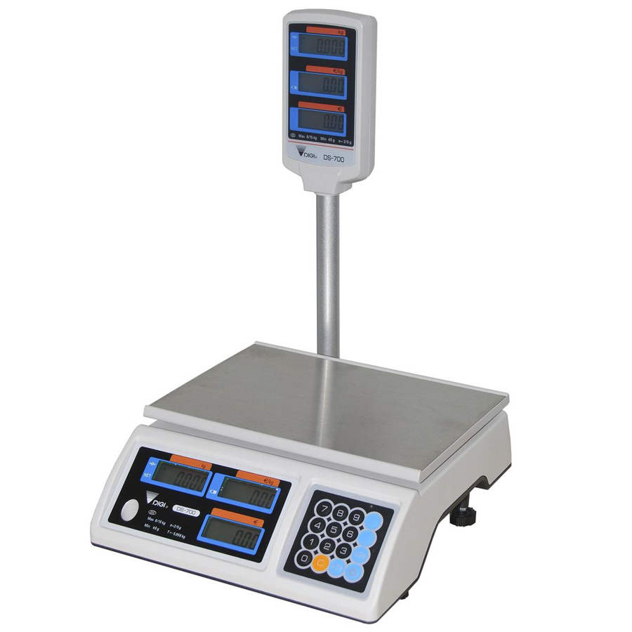 Elektroniczna waga kalkulacyjna DIGI DS-700P (z wysięgnikiem) łącząca w sobie wysokie parametry techniczne, łatwość obsługi, niezawodność, oszczędność czasu klienta i sprzedawcy, a także niski koszt zakupu. Idelanie nadaje się do pracy w handlu obwoźnym i na targowiskach.